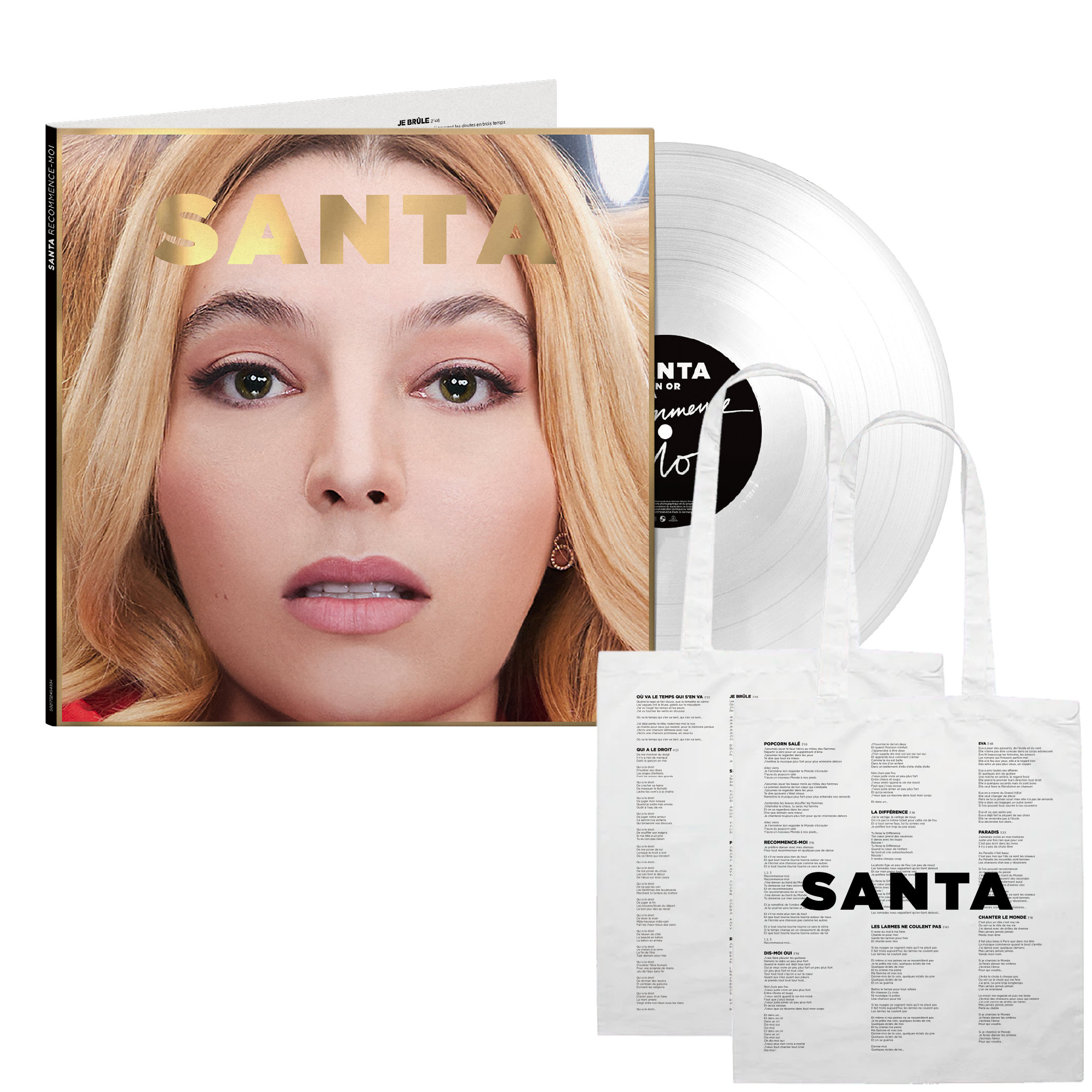 Vinyle « Recommence-moi » Edition OR transparent inclus 3 inédits : « Dis-moi oui », « Vivre pour le Meilleur », « Je Brûle » (magnifique pochette impression or à chaud)